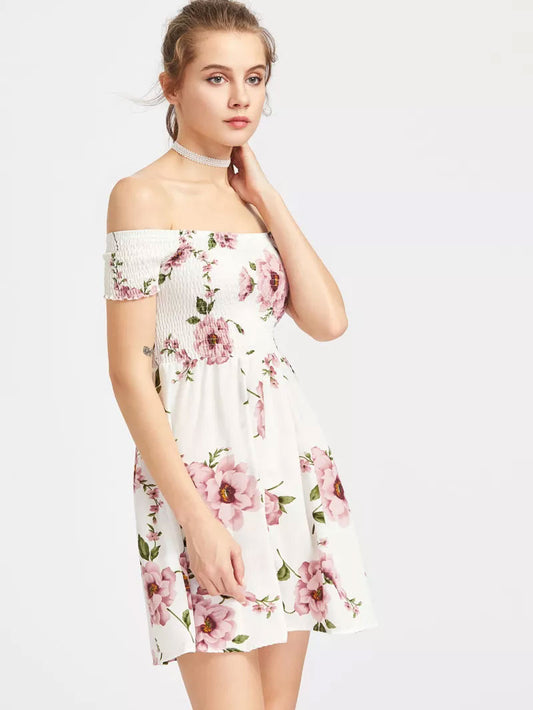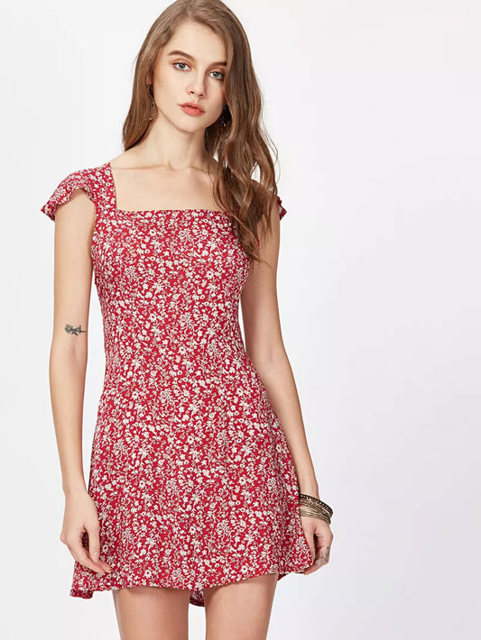 Florals Square Neck Criss Cross Bow Tie Back Dress